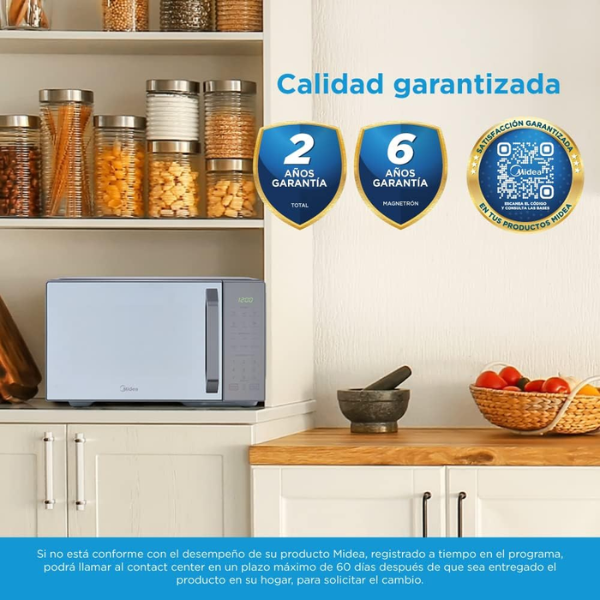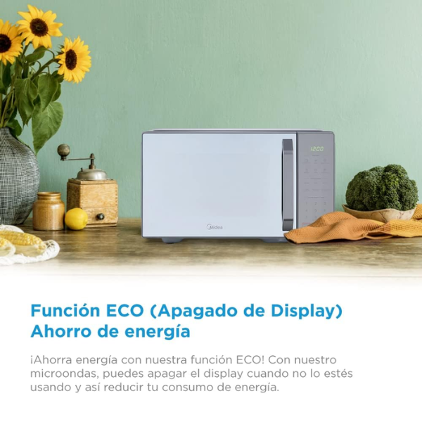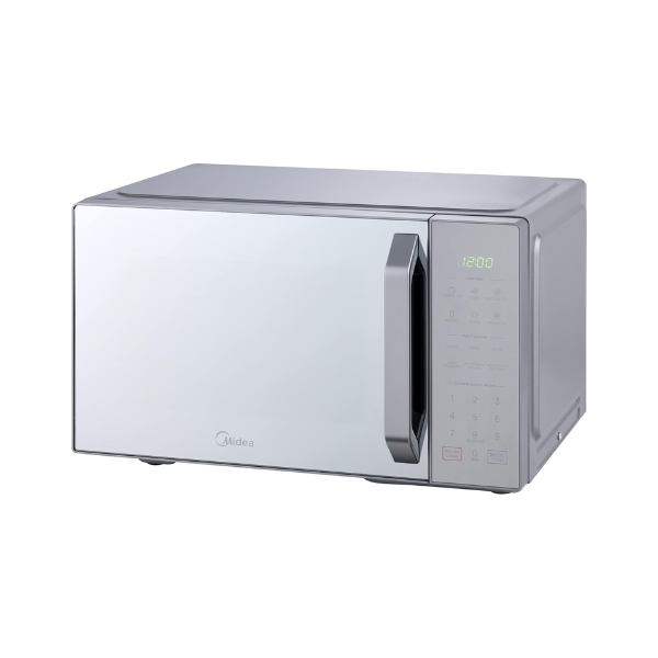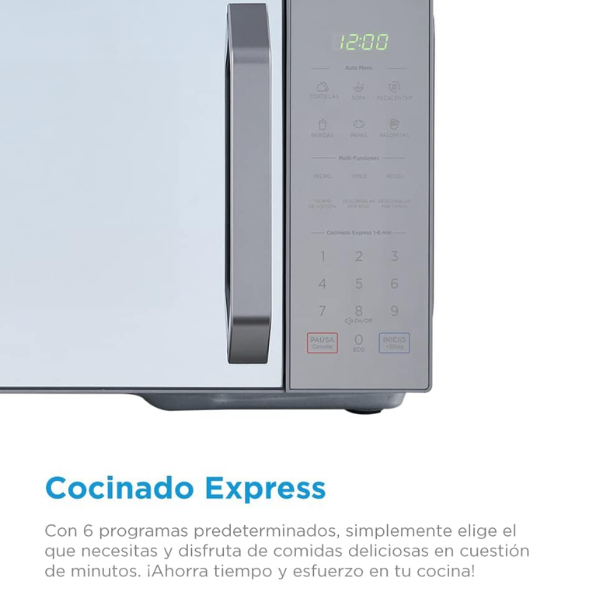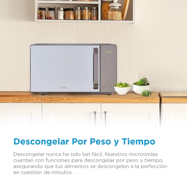 El Midea MMDX11S2MG es un horno de microondas con una capacidad de 1.1 pies cúbicos (31 litros) y acabado plateado tipo espejo. Cuenta con 10 niveles de potencia, 6 menús preestablecidos y una función para descongelar por peso o tiempo.