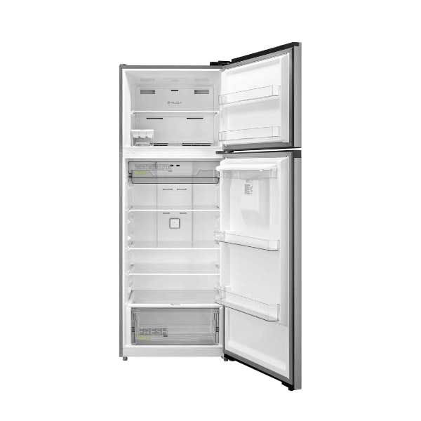 Refrigerador de 17 pies con diseño Top Mount en elegante color Bru Steel.